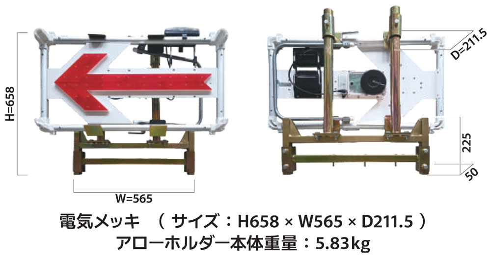 ●矢印板ホルダーサイズ(約):幅565mm×高さ658mm×厚み50mm●材質:電気メッキ●重量:約5.83kg