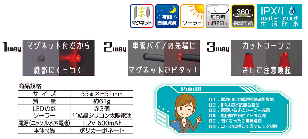 ソーラー工事灯・直径55mm(マグネット付/赤回転点滅)工事灯 保安灯 点滅灯 規制灯 小型ソーラー工事灯 ソーラー保安灯 ソーラー点滅灯 ソーラー回転灯