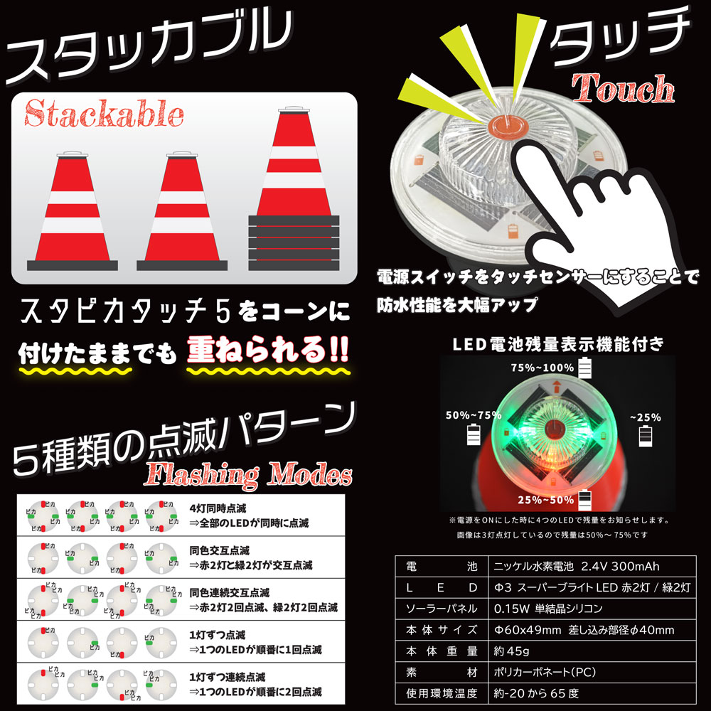 タッチセンサーソーラー工事灯・直径60mm(5種類の点灯パターン/赤緑点滅) 工事灯 保安灯 点滅灯 規制灯 タッチセンサーソーラー工事灯 ソーラー保安灯 ソーラー点滅灯
