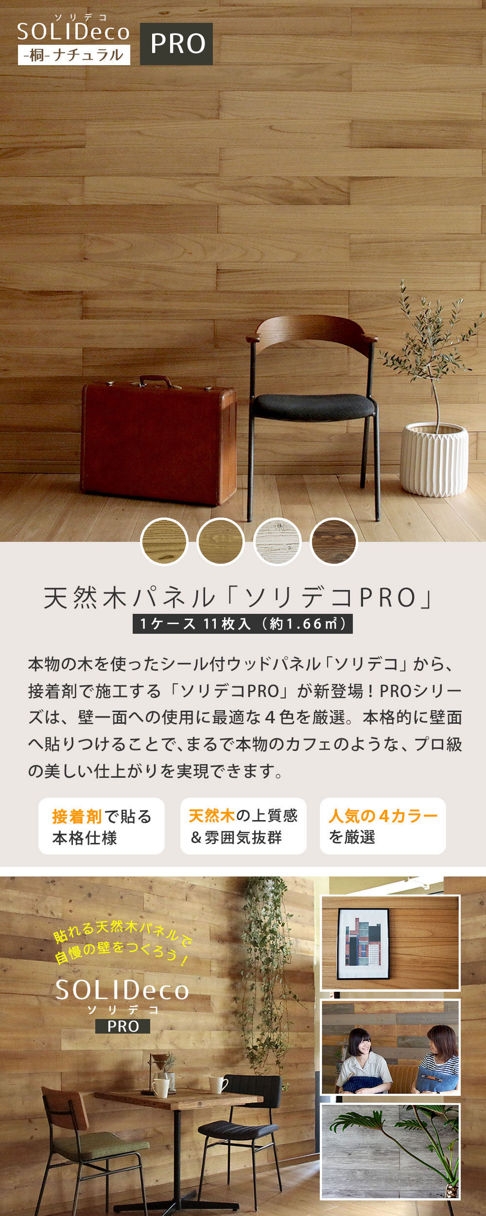 壁に貼れる天然木パネル・11枚組(約1.66m2) -桐-ナチュラル(シール付/SLDC-11P-P001KRI) 壁面パネル 貼れるパネル 天然木 接着剤仕様 DIY