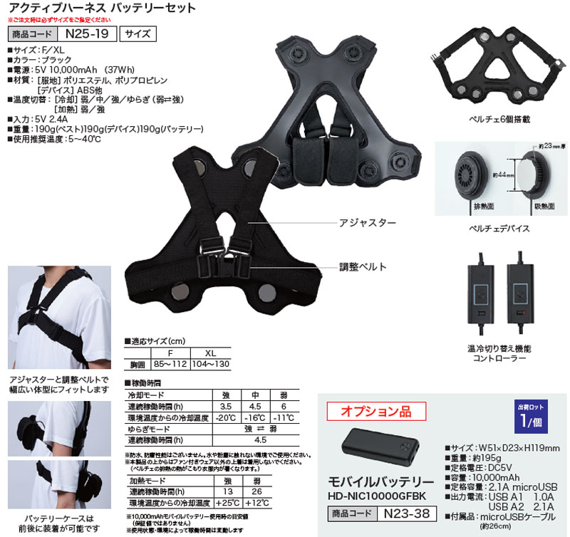 アクティブハーネス・F/XL・送料無料(デバイス/モバイルバッテリー付属/N25-19) 冷却ベスト 熱中症対策ハーネス ペルチェデバイスハーネス ペルチェ温冷却ハーネス
