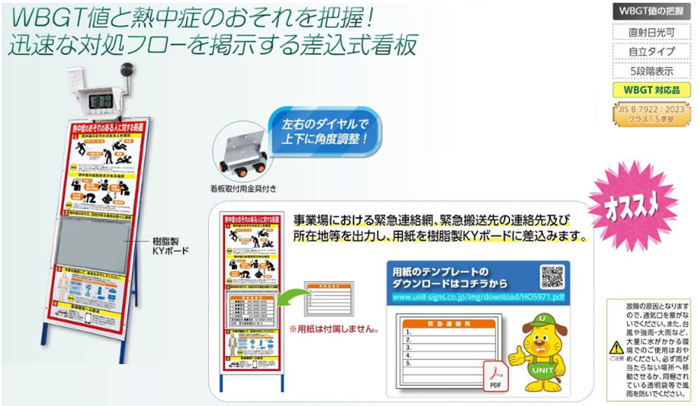 黒球付マルチ熱中症計付熱中症のおそれのある人看板セット・555×1,550(用紙のテンプレートダウンロード可能/直射日光可/自立式枠付)(安全用品・保安用品・WBGT値表示板・熱中症対策標識・温湿度計付標識)