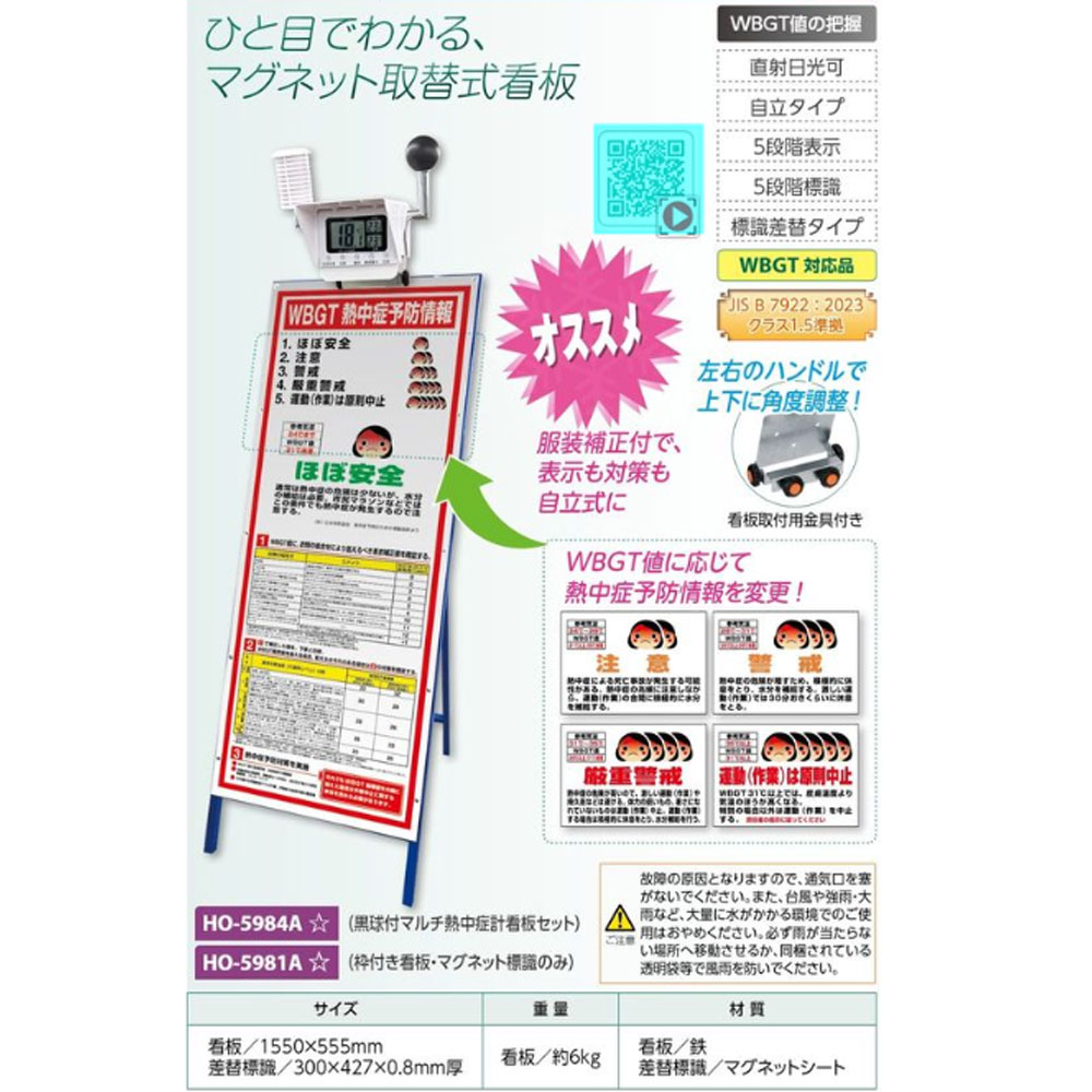 黒球付マルチ熱中症計付熱中症予防看板セット・555×1,550(直射日光可/マグネット付/自立式枠付)(安全用品・保安用品・WBGT値表示板・熱中症対策標識・温湿度計付標識)