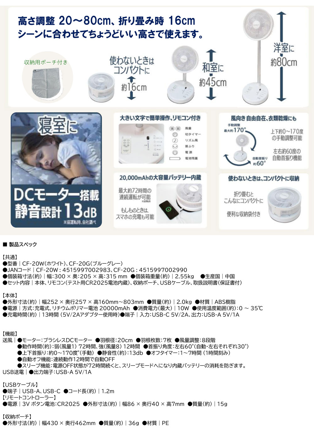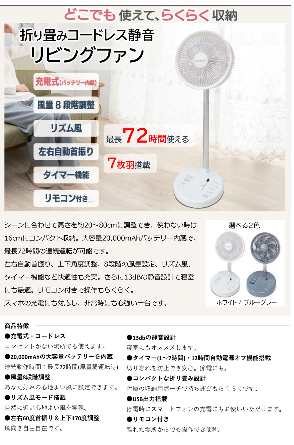 折り畳み コードレス 静音 リビングファン・252mm×257mm×160mmから803mm・ホワイト・一部地域を除き送料無料(リモコン、テスト電池、収納ポーチ、USBケーブル、取扱説明書付属)