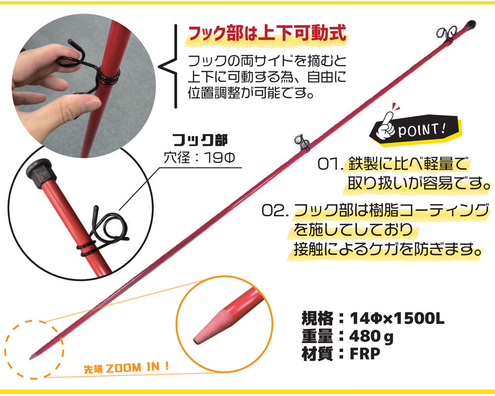 ●サイズ(約):直径14mm×長さ1,500mm●フック部穴径:約19mm●材質:FRP●重量:約480g